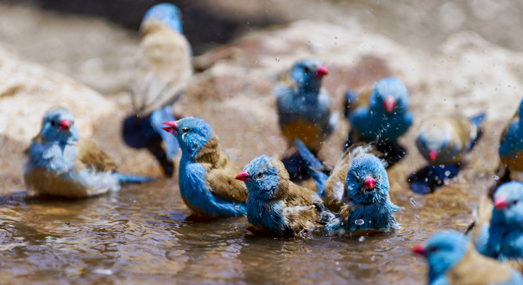 Nicht anders geht es den Vögeln in Afrika. Die heißen afrikanischen Tage laden förmlich zum Baden und Trinken ein. Jede Wasserstelle oder Wasserpfütze wird von verschiedenen Tieren benutzt. Vögel baden sehr gerne und man sieht den Spaß in ihren Gesichtern geschrieben, während sie sich im kühlenden Nass säubern.