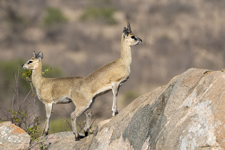 Heute zeigen wir Euch ein Pärchen Klippspringer. Diese kleinen, eher zierlichen Vertreter der Antilopen leben besonders gerne in felsigen Gebieten Afrikas. Klippspringer laufen ausschließlich auf ihren Hufspitzen. Sie sind somit perfekt an das Leben zwischen Felsen und steinigem Untergrund angepasst.