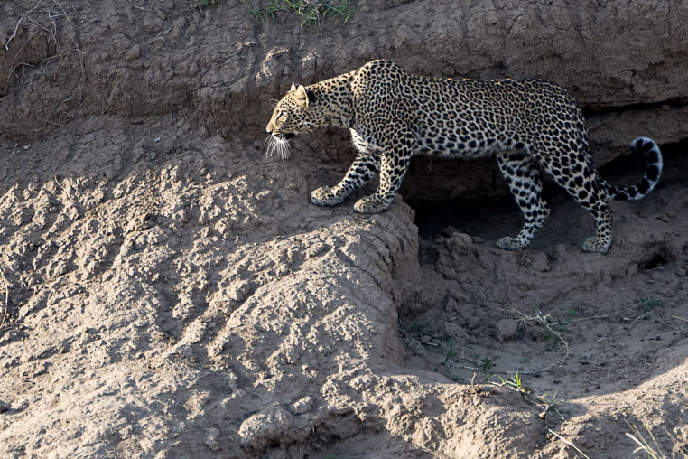 Das Leopardenfoto von heute stammt von einer Fotoreise durch den Norden Kenias. Besonders für Euch ist hierbei sicherlich der Ort, an dem diese wunderschöne Raubkatze fotografiert wurde. Die meisten kennen den Leoparden auf Bäumen sitzend bzw. schlafend oder versteckt im Gebüsch liegend. Solange es sehr heiß ist, ist das auch oft der Fall. Fakt ist aber, das Leoparden ihre Beute mit einem Überraschungsangriff erbeuten. Das bedeutet, dass der Jäger sich möglichst leise sehr nah an die erspähte Beute anpirschen muss.