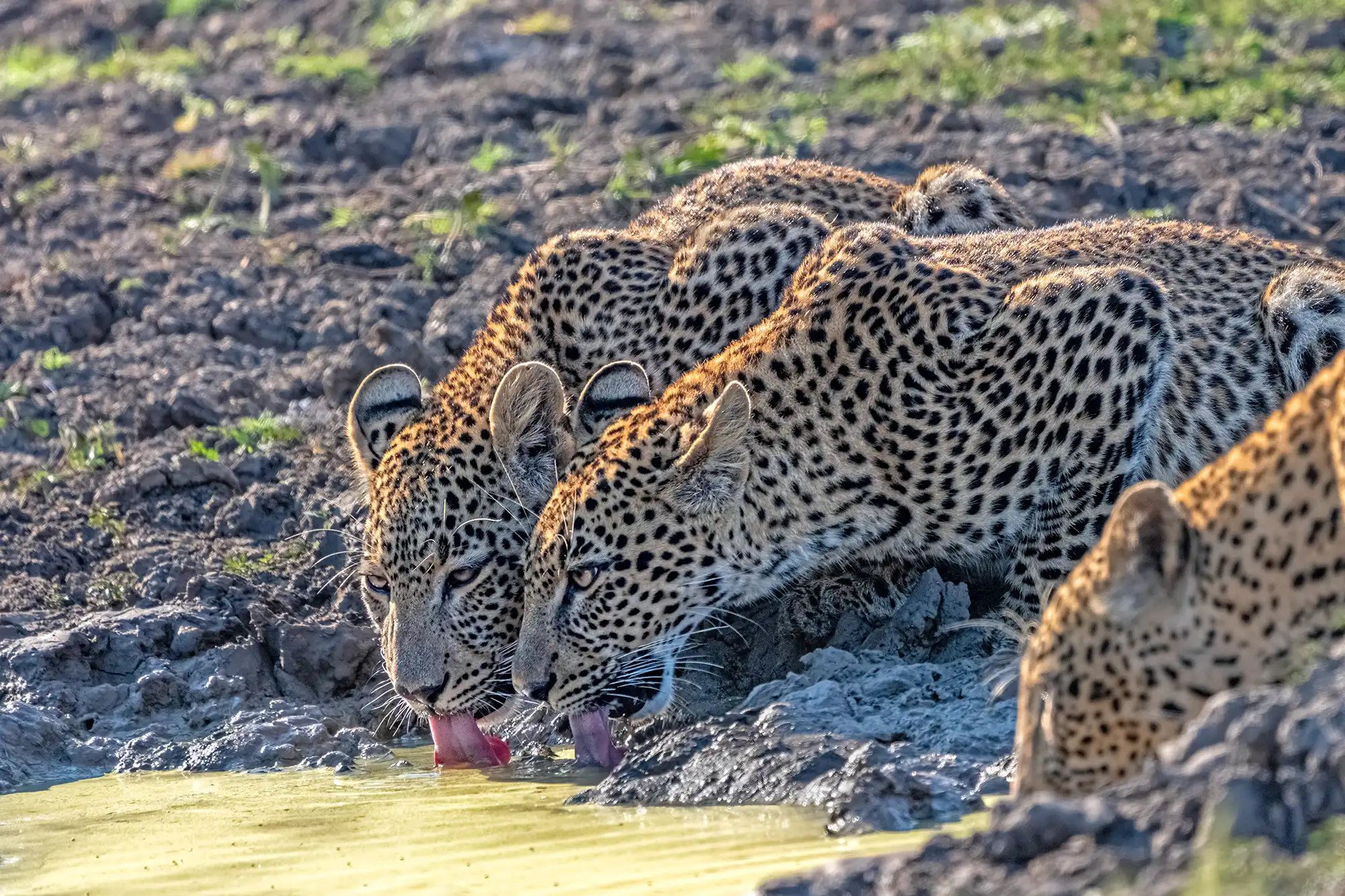 Manchmal sind es nicht die spektakulärsten Bilder, die am längsten nachhallen.Dieses Foto zeigt eine Leopardenmutter mit zwei halbwüchsigen Kindern an einem Wasserloch in Sambia. Eine Szene, die man in der Wildnis nur selten erlebt. Leoparden sind Einzelgänger, und Begegnungen mit ihren Jungen bleiben meist verborgen.