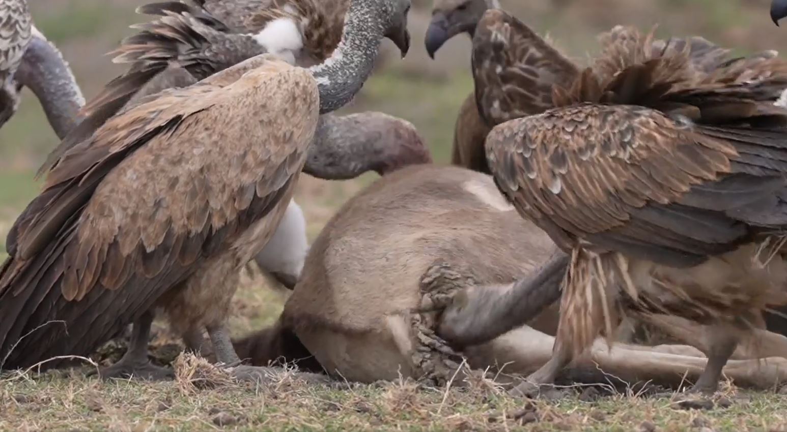 Die Landschaft ist trocken und es gibt kaum noch Gras für die Tiere. Es hat seit langem nicht mehr geregnet und viele Tiere verhungern. Die Sümpfe haben zwar noch einige Pflanzen aber diese sind für viele Tierarten nicht zu gebrauchen. Tausende Tiere sind bereits tot und die andere sind in einem schlechten Zustand. Dafür geht es den Geiern...