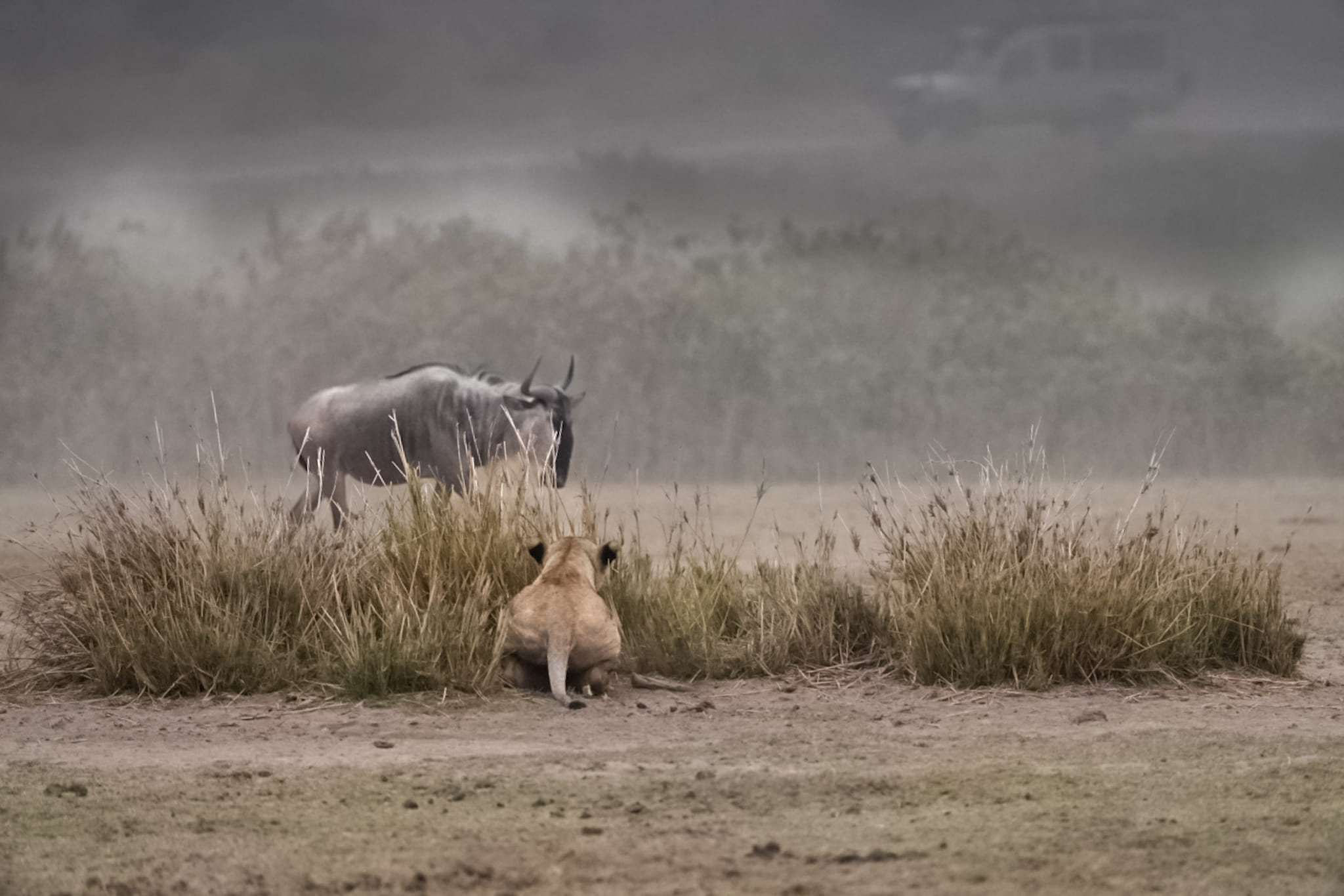 Eine Gnuherde kommt im aufgewirbelten Staub auf eine Löwin zu. Sie positioniert sich hinter dem Gras und sie wird auch von den Gnus nicht erkannt. Das erste Gnu kommt der Löwin so nah, dass sie hätte mühelos das Gnu fangen können. Sie hat es jedoch nicht getan und sie wartete auf ein anderes Gnu. Dann hat das erste Gnu die Löwin gerochen und die anderen alarmiert. Und dann war die Jagd...