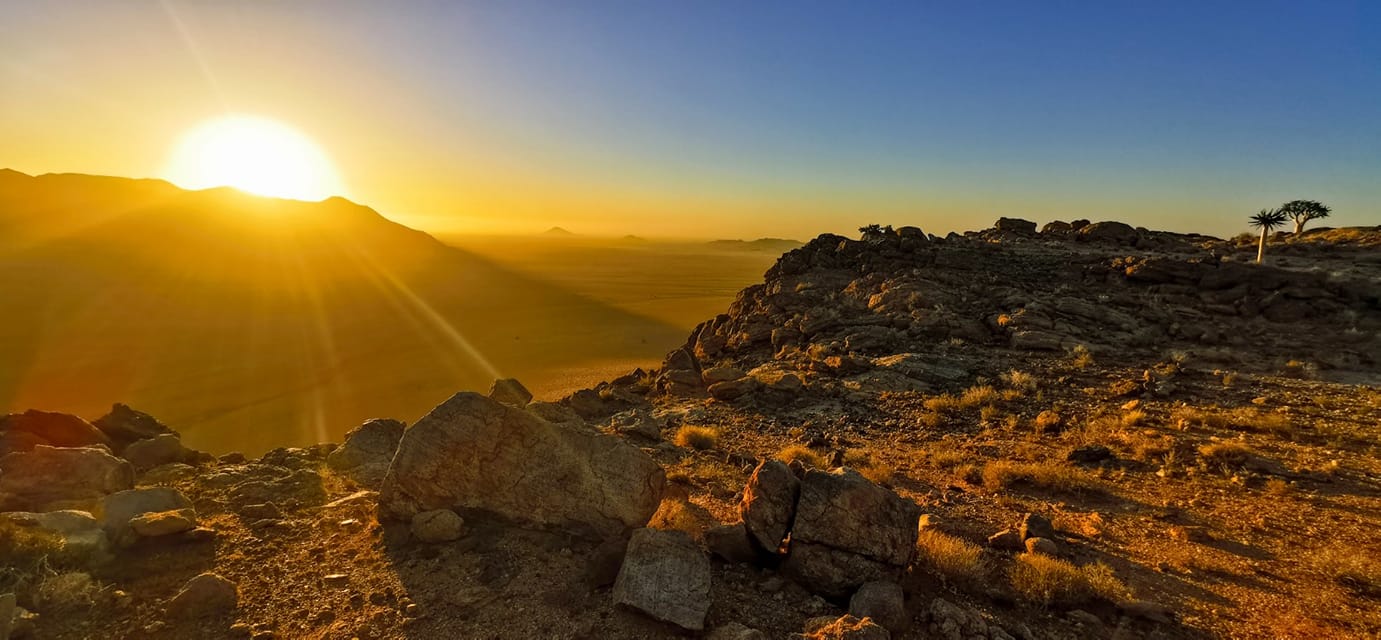 Was für ein Glück, hier in der Wildnis zu sein. Ich muss nicht erst sterben, um ins Paradies zu kommen. Das Paradies ist genau hier. Mit diesem Handy-Bild sende ich meinen Freunden einen herzlichen Gruß aus der Wildnis Afrikas zu. Die Landschaften Namibias sind so schön, dass ich keine professionelle Kamera brauche, um diese sichtbar zu machen. Ein Handy oder eine kleine Kompaktkamera reichen hierfür aus. Die Teilnehmer meiner Fotoreise und ich hatten gestern Abend hier unser SUNDOWNER und viel Spaß zusammen. Auf diesem Berg und auf weiteren Bergen, die einem Freund von mir gehören, befinden sich zahlreiche Köcherbäume und schöne Felsen, die wir als Vordergrund für unsere Fotografie verwendet haben. Es war ein fantastischer Fotografie-Tag mit einem spektakulär schönen Sonnenuntergang. Gerade eben fahren wir in Richtung Kolmanskop, um dort Bilder in der Geisterstadt aufzunehmen. Ich sende Euch diesen Bericht, wie so oft, aus dem fahrenden Auto zu.