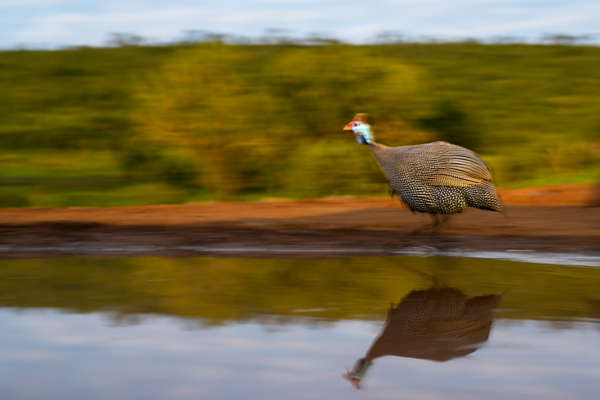 Seit gestern marschiert dieses Perlhuhn immer wieder die Ränder des Wasserlochs auf und ab und verbreitet Hektik. Während der Nacht hatten wir unsere Ruhe vor ihm. Beim ersten Licht des Tages ist das Huhn wieder da. Naja, es ist nicht wirklich schlimm. Hier ist eine Mitziehaufnahme von dem Hibbel-Herbert. ![]()
