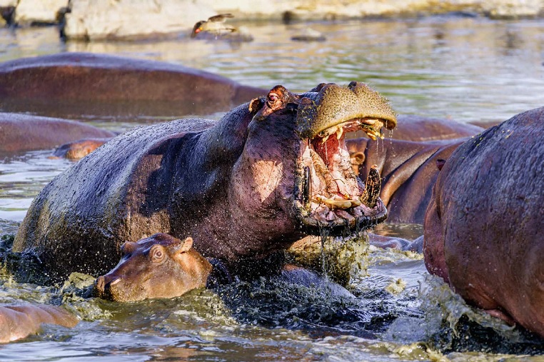 Da der Flussabschnitt klein und die Anzahl der Flusspferde groß ist, sind Rangeleien vorprogrammiert. Besonders aggressiv sind die großen Bullen, die ihr Territorium verteidigen und auch Weibchen mit kleinen Babys, die ihre Kinder beschützen wollen. Einen liebevollen Umgang miteinander kennen die Flusspferde nicht. Es ist eine raue Gesellschaft, in der diese Tiere leben. Dies sieht man auch an zahlreichen Narben an ihren Körpern. Flusspferde sind ebenso für Menschen sehr gefährlich und töten jedes Jahr zahlreiche Menschen in Afrika – vor allem dann, wenn sie sich außerhalb des Wassers befinden und dort Menschen begegnen und ihr Fluchtweg zum Wasser abgeschnitten oder zu weit ist.