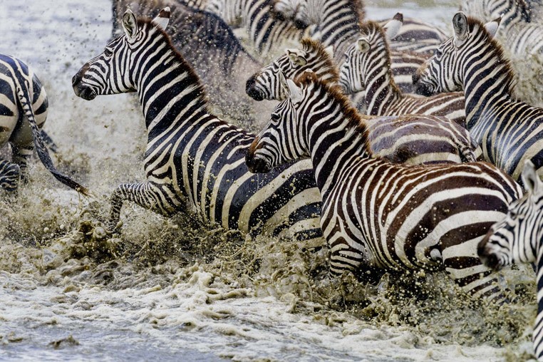das 13. Bild des Bild des Tages entstand natürlich auch auf einer der zahlreichen Fotoreisen, während einem der größten Naturschauspiele auf dieser Erde – der Migration. Es zeigt einige Zebras, die rennend das Wasser durchqueren.