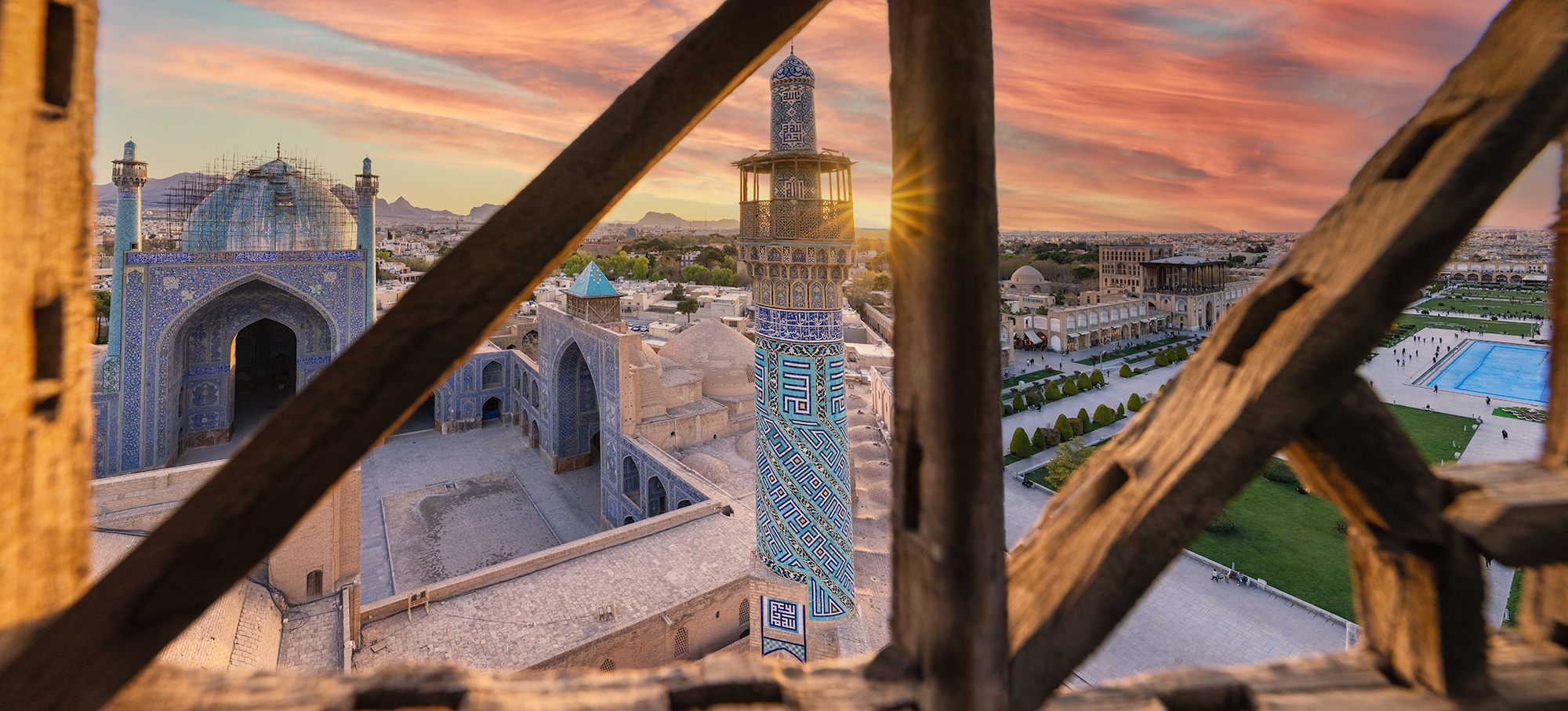 Es zeigt den wunderschönen und riesigen Platz, sowie die angeschlossene Moschee aus einer ungewöhnlichen Perspektive und mit einem noch nie zuvor gezeigten Vordergrund.
