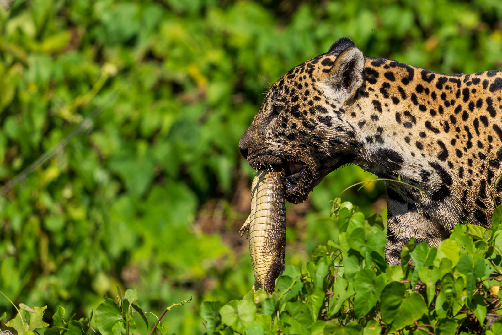 Kaimane sind selbst Jäger und dennoch werden sie selbst vom König des Dschungels gejagt. Im vergangenen Jahr haben wir gesehen, wie ein Jaguar direkt vor unserem Boot einen zwei Meter großen Kaiman im Wasser getötet und dann aus dem Wasser herausgezogen hat. Dieses Jahr fand ein weiterer Kill vor unserem Boot statt, aber niemand konnte es fotografieren, weil zwischen uns und der Raubkatze einige Pflanzen den Blick versperrt haben. Dann haben wir diese Jaguar-Dame gesehen, die einen kleinen Kaiman getötet hat und stolz die Beute zu ihren Kindern brachte.