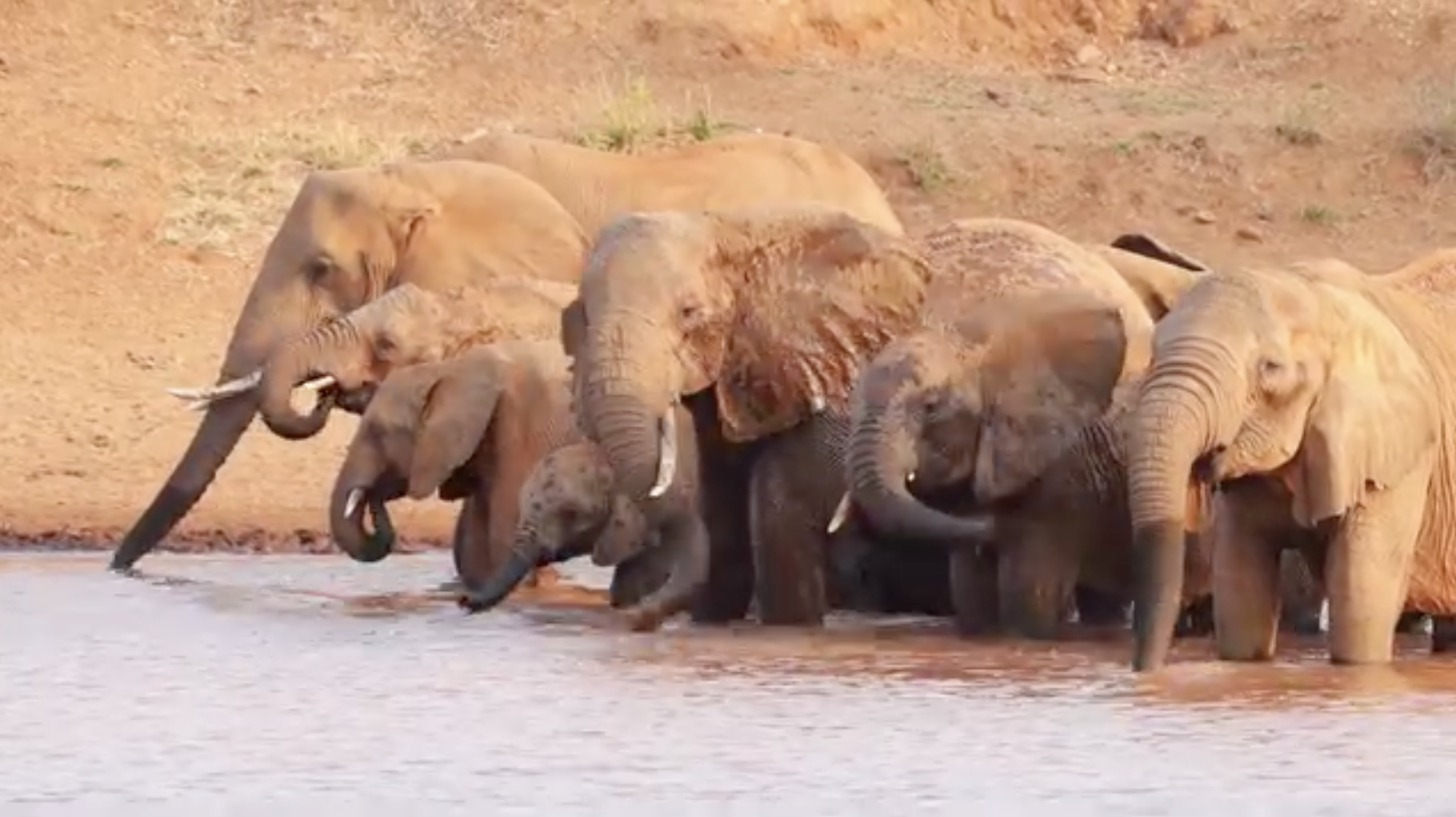 Wir beobachten gerade eine große Elefantenfamilie an einem Wasserloch. Es ist wunderbar, diese sanften Riesen aus der Nähe zu bewundern.