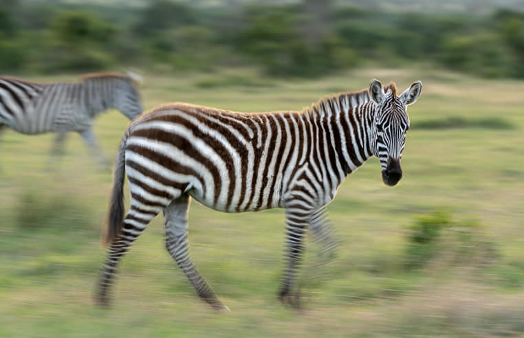 Dabei wählen wir eine sehr langsame Verschlussgeschwindigkeit an der Kamera und ziehen die Kamera mit derselben Geschwindigkeit mit, mit sich das Tier bewegt.