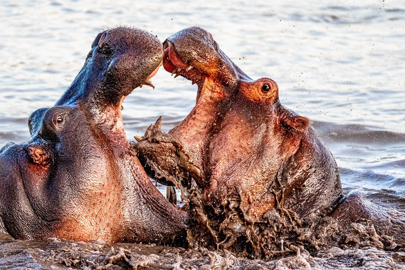 Fotografiere den Kampf der Giganten aus nächster Nähe in Tansania! Ich wurde eine Zeitlang von Filmproduzenten gebucht, um die Filmteams in Afrika zu den Plätzen zu bringen, die besonders ergiebig und interessant sind. In Tansania kenne ich unter anderem einen Platz, wo wir täglich zahlreich Flusspferde aus nächster Nähe filmen oder fotografieren können und das ohne jegliches Risiko. Flusspferde sind häufig schlecht gelaunt und deswegen gibt es an jedem Tag etliche Kämpfe und Rangeleien zwischen den Tieren im Wasser und genau diese Situationen können wir aus wenigen Metern Abstand erleben und fotografieren, während wir auf dem Boden sitzend auch vom Stativ aus fotografieren können. Dieser Platz gehört mit Abstand zu den absolut besten Stellen in Afrika, um das Leben der Flusspferde zu dokumentieren. Ich nehme die Teilenehmer meiner Fotosafaris immer an einem frühen Morgen – vor dem Sonnenaufgang – zu dieser Stelle, um dann beim ersten Licht die Rückkehr der Flusspferde von ihrem nächtlichen Landgang zu fotografieren und dies natürlich im besten Licht der aufgehenden Sonne. Dies ermöglicht uns auch immer wieder die kleinen Jungtiere, die äußerst süß sind, außerhalb des Wassers zu sehen. Während des Tages sind nämlich die Jungtiere im Wasser und man sieht nur ein kleines Stück von ihrem Rücken oder den Kopf, was zum Fotografieren oft zu wenig ist. Im September werde ich wieder durch die besten Nationalparks Tansanias fahren und wenn Du Lust und Zeit hast, kannst Du mit mir dahin reisen! Dort kannst Du unter anderem auch die Flusspferde fotografieren.