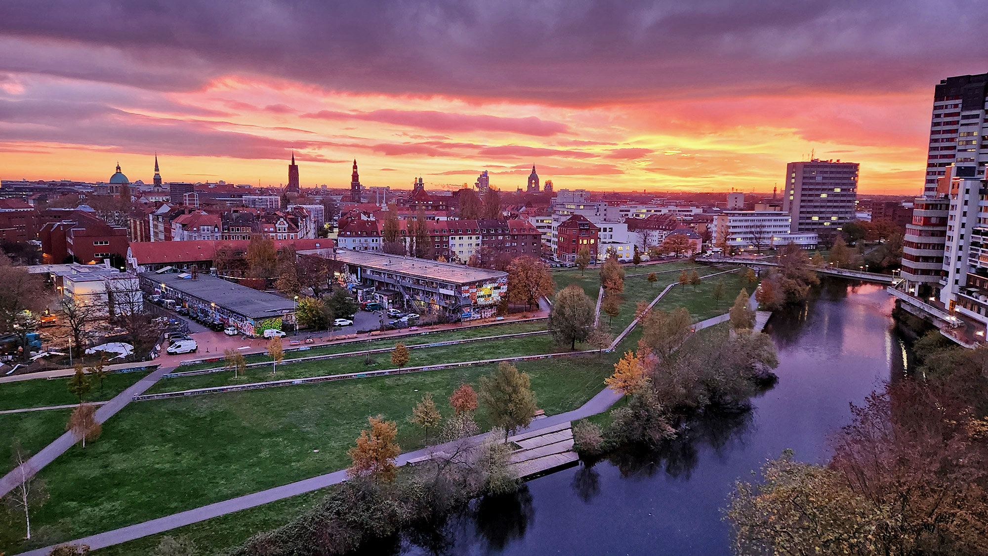 Das heutige Bild habe ich beim Sonnenaufgang mit meinem Handy aus dem Balkon meiner Wohnung aufgenommen. Im Vordergrund ist der Fluss Ihme, der direkt an unserem Haus vorbeifließt. Im Hintergrund seht Ihr die Innenstadt von Hannover mit unserem Rathaus, dem Nord LB Gebäude, der Marktkirche und einigen weiteren Kirchen, die über die Dächer Hannovers hinausragen.