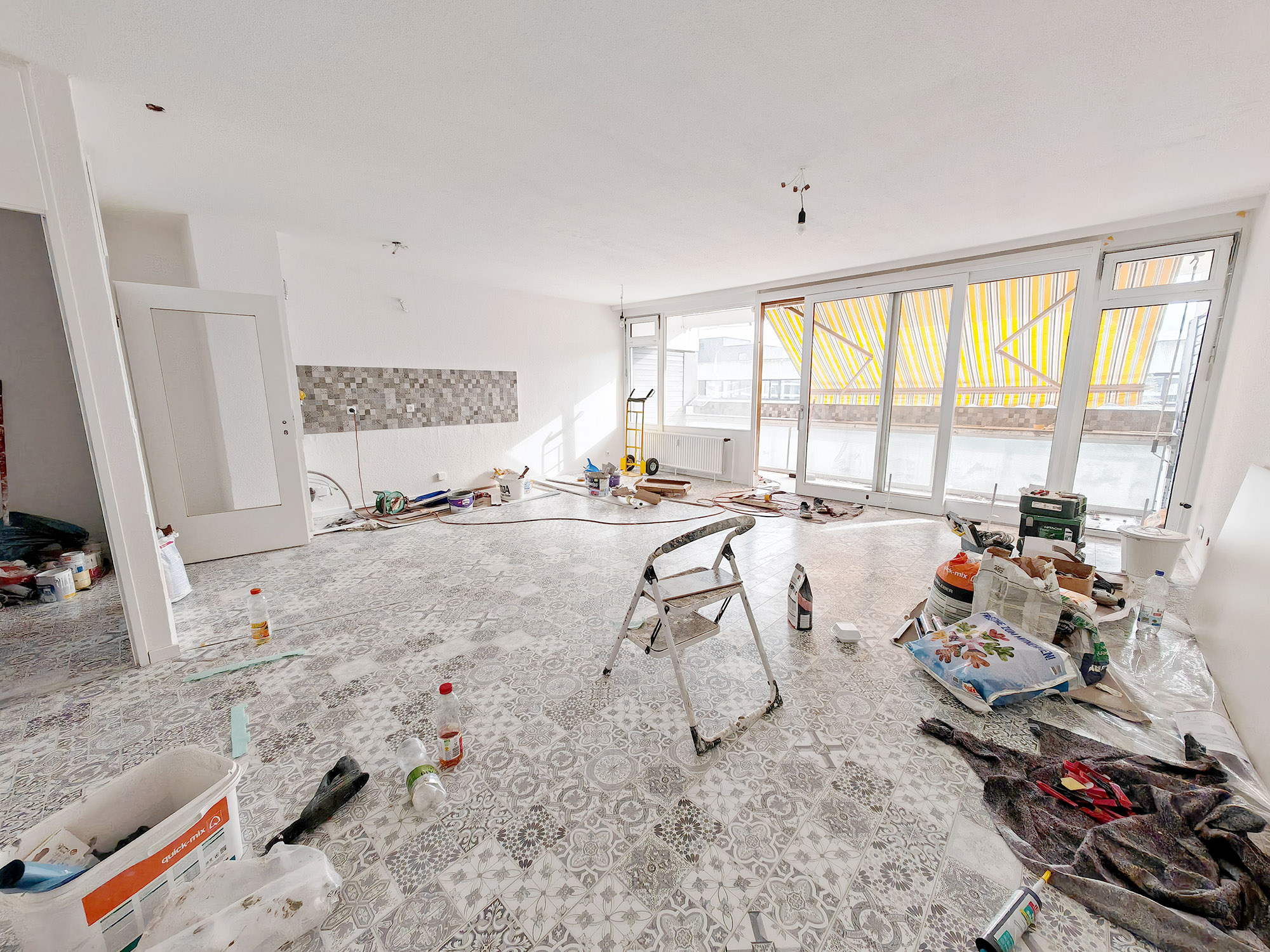 Da die Sanierungsarbeiten noch nicht zu 100% abgeschlossen sind, zeige ich Euch hier nur ein paar Handy-Fotos im jetzigen Zustand. Wenn die Sanierungsarbeiten fertig sind, wird die Wohnung genauso schön und wertig aussehen, wie die anderen Wohnungen, die ich bisher saniert habe. Ihr habt vielleicht Fotos davon gesehen. Bitte verzeiht mir die schlechten Handy-Fotos, die auf die Schnelle nur das ungefähre Aussehen der Wohnung visualisieren sollen!