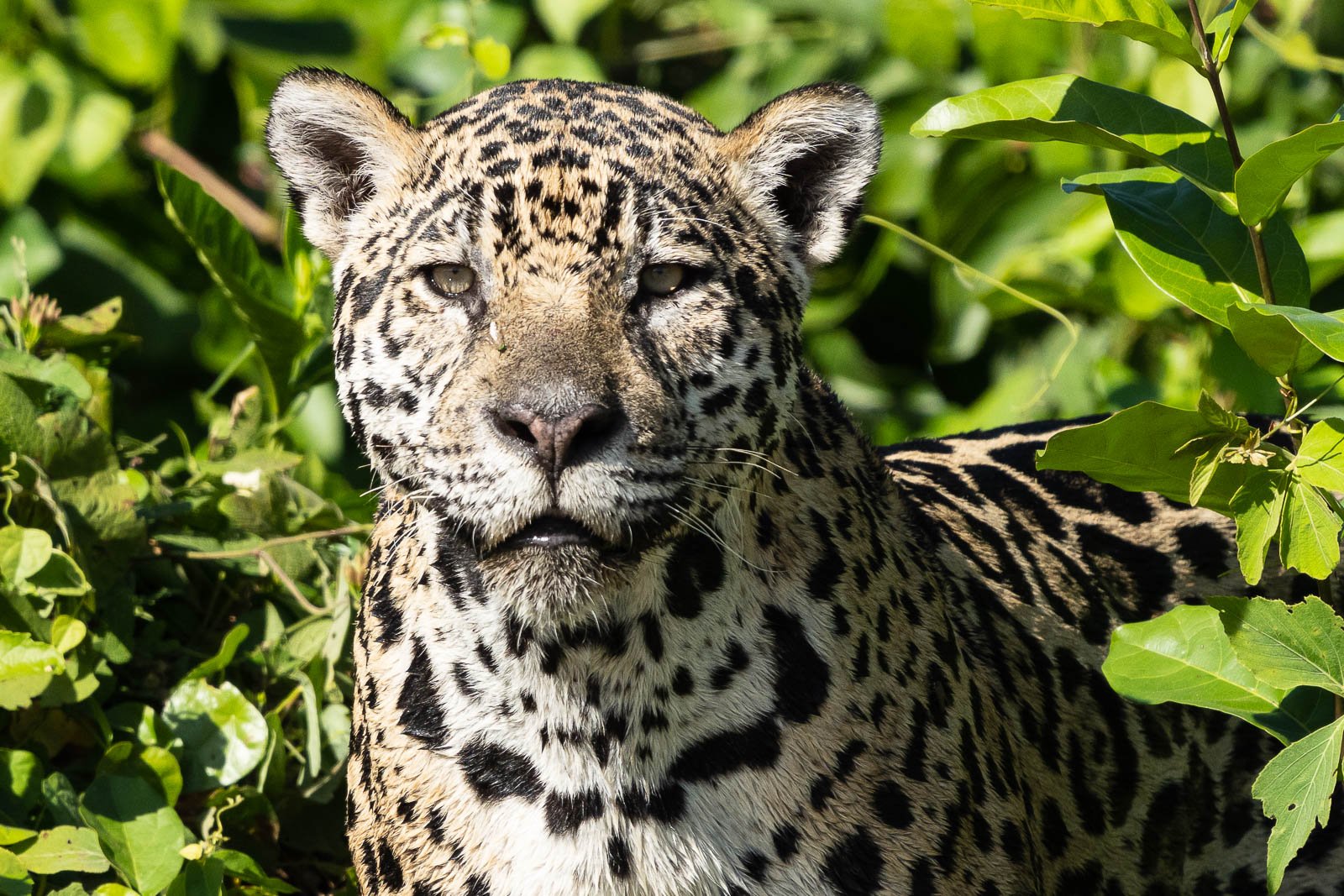 Jaguar beim Laufen, Schwimmen, Gähnen, Verstecken-Spielen, sich an Beute heranpirschen und Springen. Heute morgen hatten wir das große Glück, über mehrere Stunden einen Jaguar auf der Suche nach seiner nächsten Mahlzeit zu begleiten. Es war äußerst spannend zu beobachten, wie die Großkatze durch ihr Territorium lief und schwamm, um etwas zum Jagen zu finden. Der Jaguar hat einmal versucht, ein Kaiman zu töten. Er sprang von etwa zwei Meter hohen Uferrand in den Fluss aber leider blieb dieser Versuch erfolglos. Später hatte er eine weitere Chance, ein Capybara zu jagen aber er hat das Wasserschwein zu spät gesehen. Unsere Fotografen und ich hatten einen sensationell ergiebigen und spannenden Vormittag und sind mit tausenden Jaguar-Bildern zurück zu unserer Unterkunft gekommen. Vor unserer Jaguar-Sichtung hatten wir bereits eine Tolle Begegnung mit Riesenottern und einigen Vogelarten. Diese Bilder zeige ich Euch später.