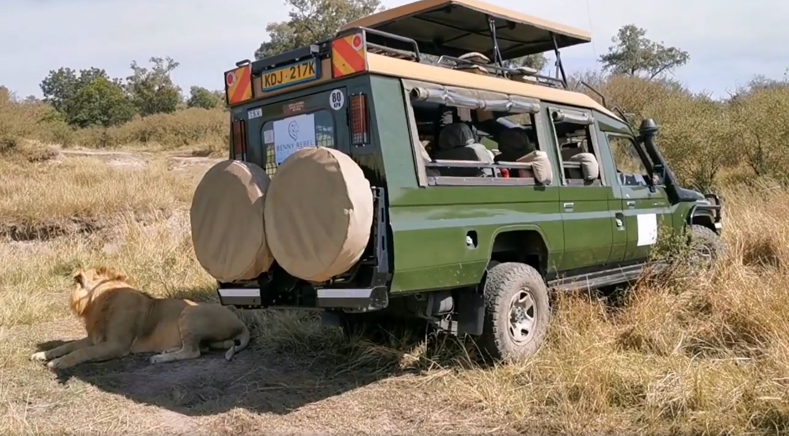 Einer von den vier Löwen, die heute Morgen einen Büffel getötet haben, ruht sich gerade im Schatten unseres Autos aus. Er ist von sich dahin gekommen und macht nun ein Nickerchen.