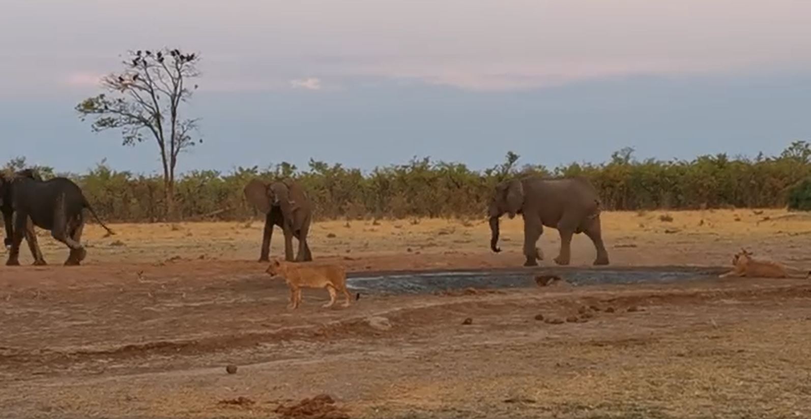 Die Story von unserer heutigen Fotoreise in Botswana. Löwen töten einen Büffel neben einem Wasserloch. Durstige Elefanten vertreiben die Löwen und andere Tiere vom Wasserloch. Löwen warten, bis die Anzahl der Elefanten immer weniger wird. Dann vertreiben sie die restlichen Elefanten vom Wasserloch. Dazwischen tausende Fotos.