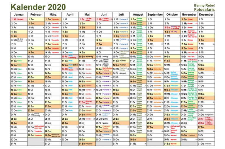 Der Kalender soll zeigen, welche Fotoreisen in welchen ungefähren Zeiträumen in 2020 stattfinden sollen. Die genauen und verbindlichen Daten werden nach und nach von meinen Agenten freigegeben und dann von mir weitergeleitet.