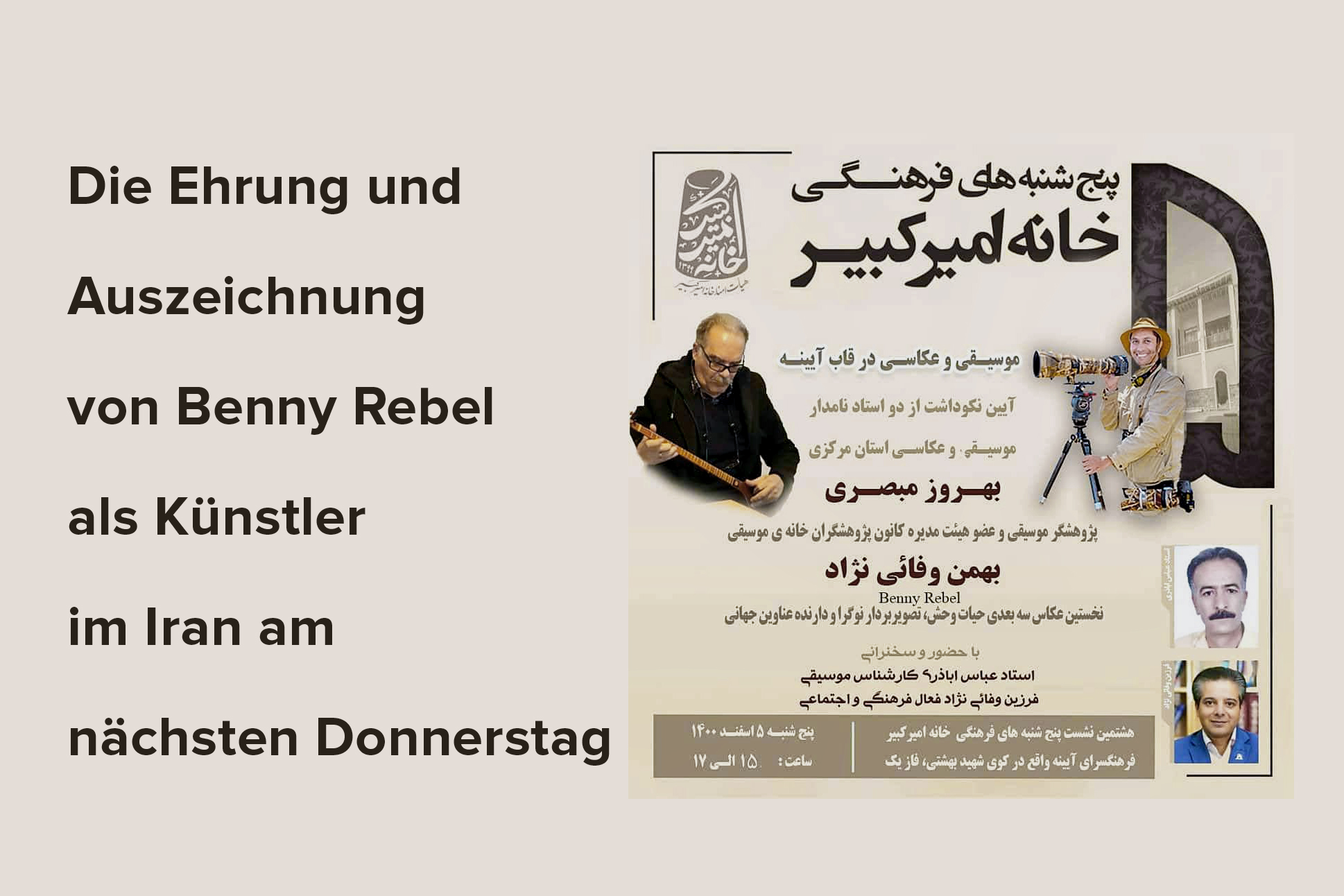 Liebe Freunde, ich freue mich sehr, Euch mitteilen zu dürfen, dass ich zusammen mit einem hervorragenden Musikwissenschaftler am nächsten Donnerstag, den 24.02.2022 im Iran geehrt werde. Wir werden für unsere bisherige künstlerische Arbeit Ausgezeichnet und es sind einige Hundert Künstler, sowie offizielle Persönlichkeiten zu dieser relativ großen Zeremonie eingeladen. Ich freue...