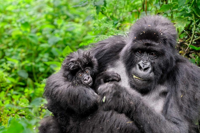 Berggorillas in Ruanda nahe von Tansania klettern nur sehr selten auf Bäume, sie leben fast ausschließlich auf dem Boden. Sie sind, wie wir, tagaktiv. Für die Nacht bauen sie sich ein Schlafnest, das auch Ästen und Blättern besteht. Die Tiere sind darin so geschickt, dass sie dafür nur wenige Minuten benötigen! Sicherlich legen die Affen nicht...114. Bild des Tages: Fotosafari Tansania/Ruanda und die Berggorillamutter mit Kind
