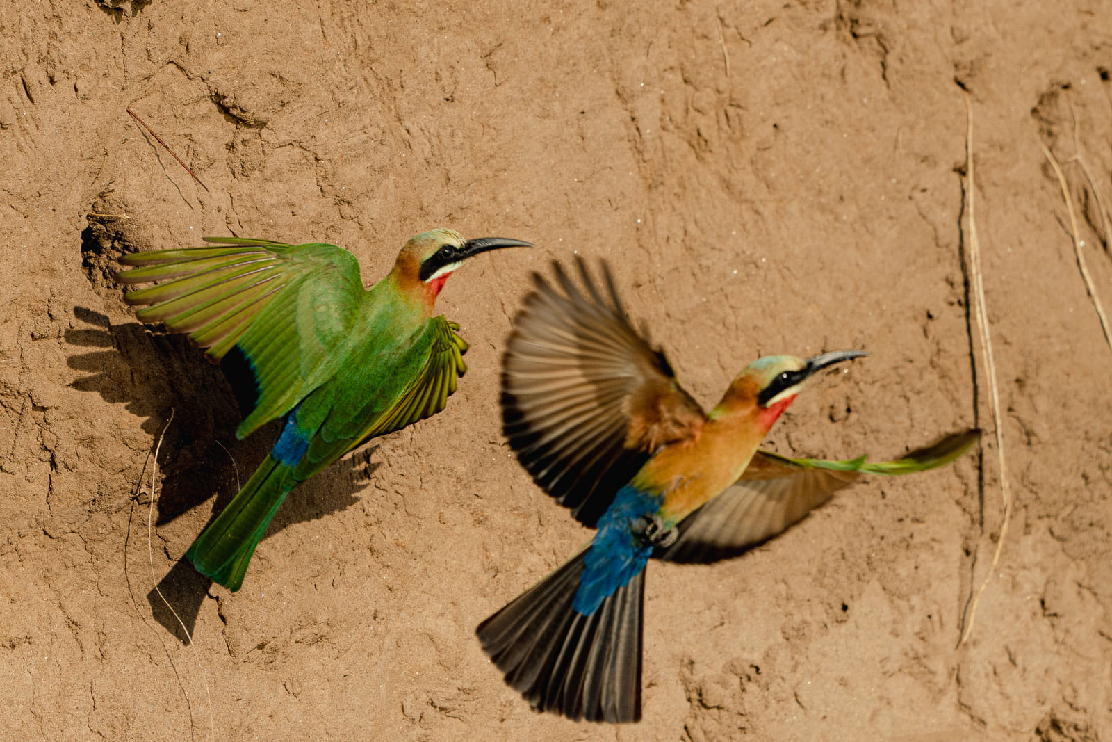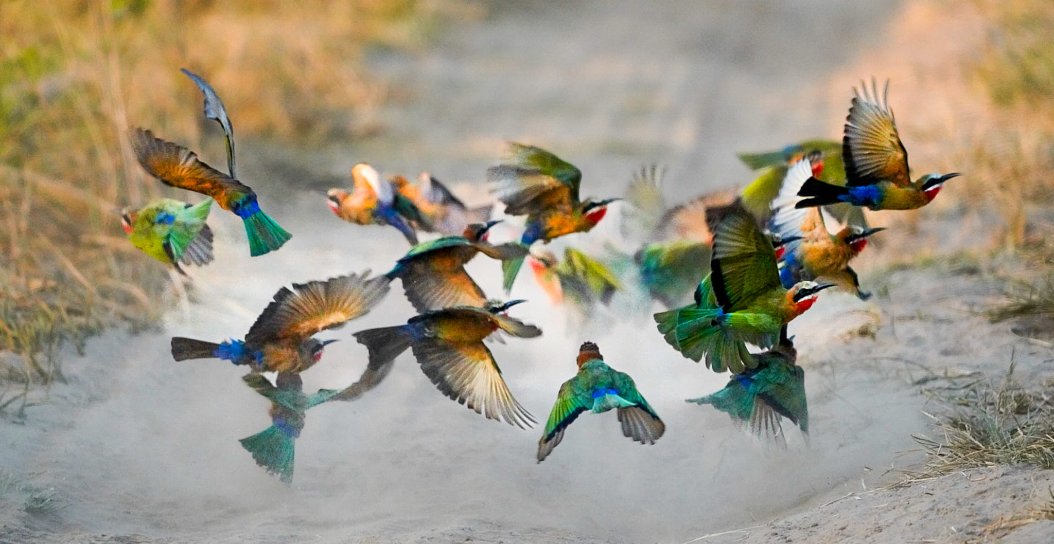 Wir fotografieren eine große Bienenfresser-Kolonie, die am Ufer des mächtigen Zambezi-Flusses lebt. In Sekunden-Takt fliegen einige Vögel zu ihren Nestern hin und andere wieder aus dem Nest heraus. Einige streiten sich und andere baden im Fluss. Sie scheinen Freude daran zu haben, sich in den Fluss zu stürzen, um dabei sowohl zu trinken, als auch sich abzukühlen. Hier können...