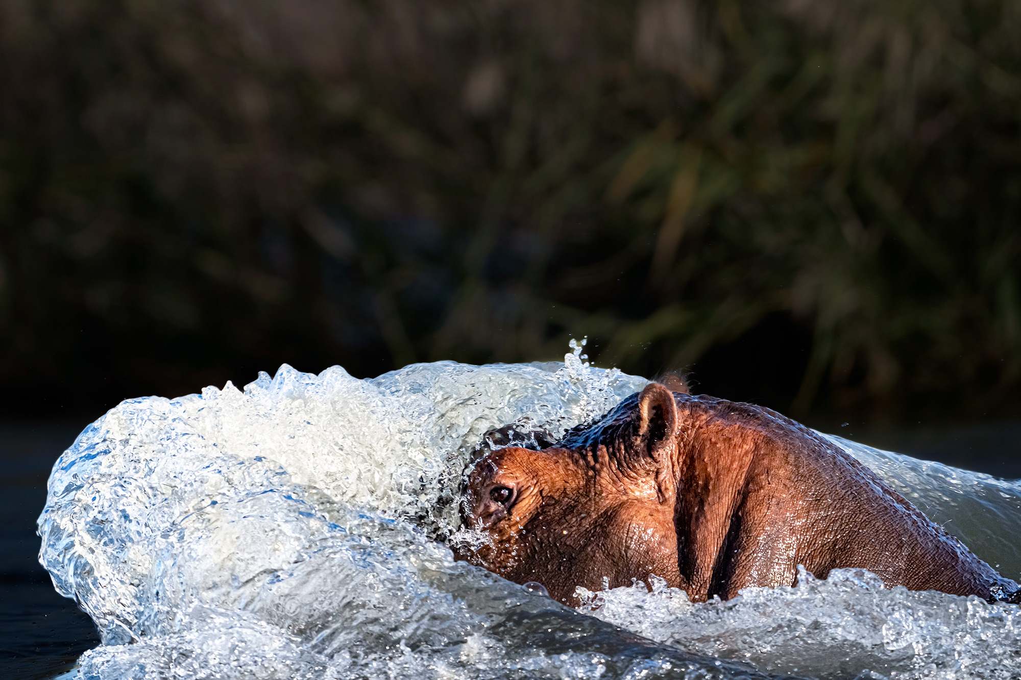 Ein Flusspferd rennt ins Wasser. Es schiebt eine Wasserwelle vor sich hin, bis es unter Wasser abtaucht. Es ist nur ein kurzer Augenblick, wo diese Welle zu sehen ist. Ich nehme davon eine Bildserie auf und das hier gezeigte Foto gefällt mir am besten. Die Nase und die Schnauze des riesigen Flusspferdes sind hinter der Welle verschwunden, aber das Auge und das Ohr sind noch zu...