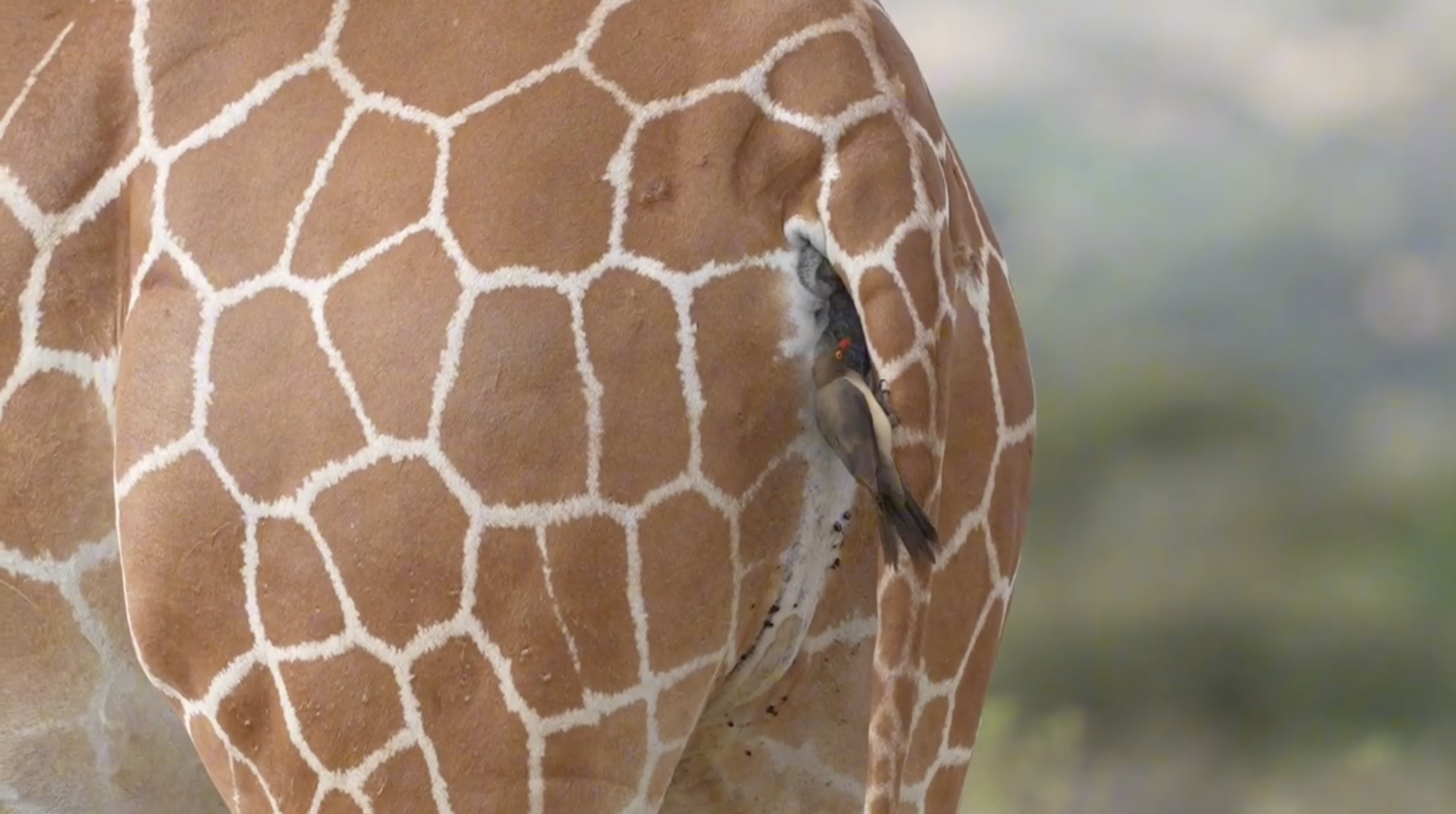 Ein Madenhacker säubert den Hintern einer Giraffe