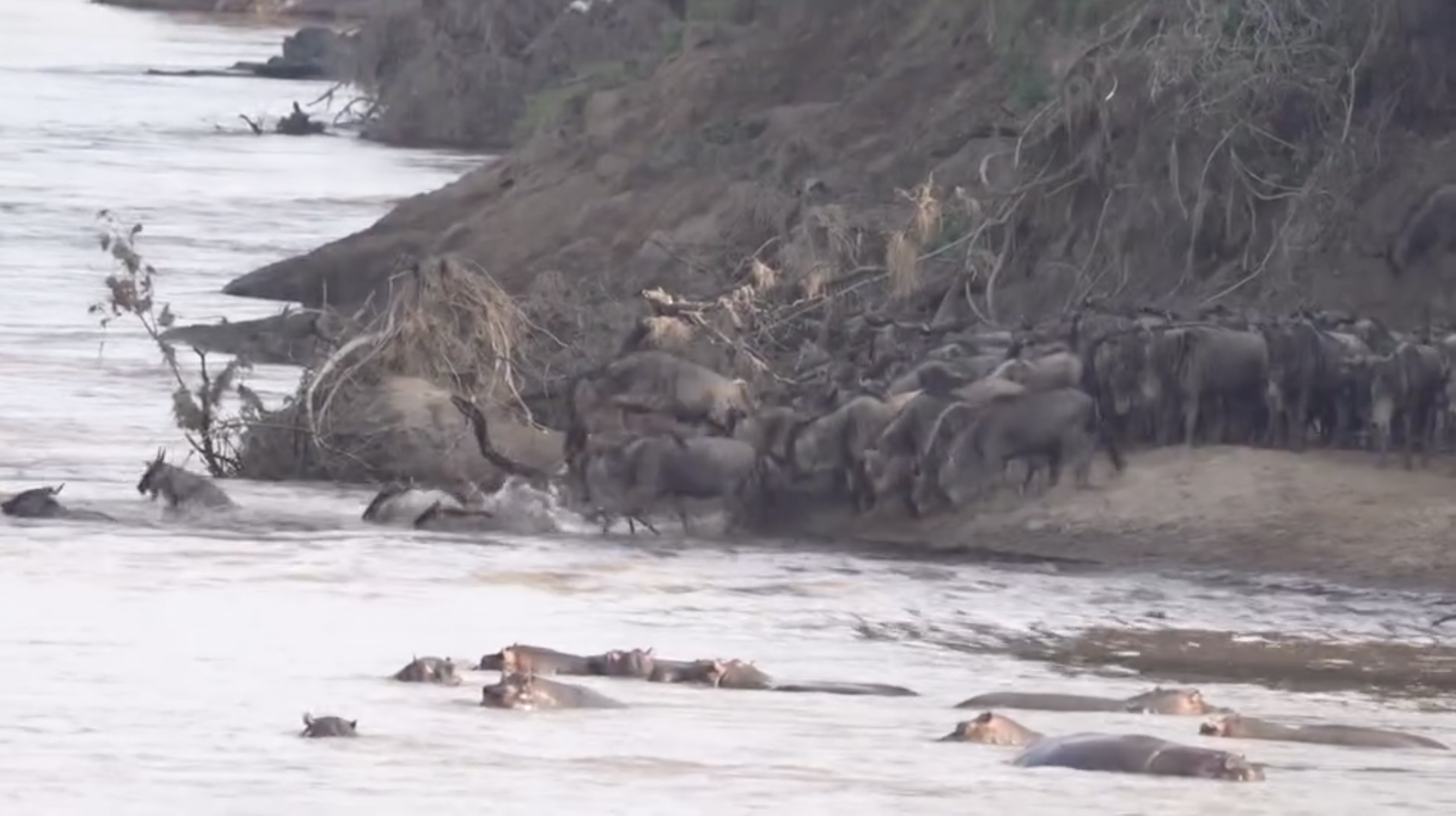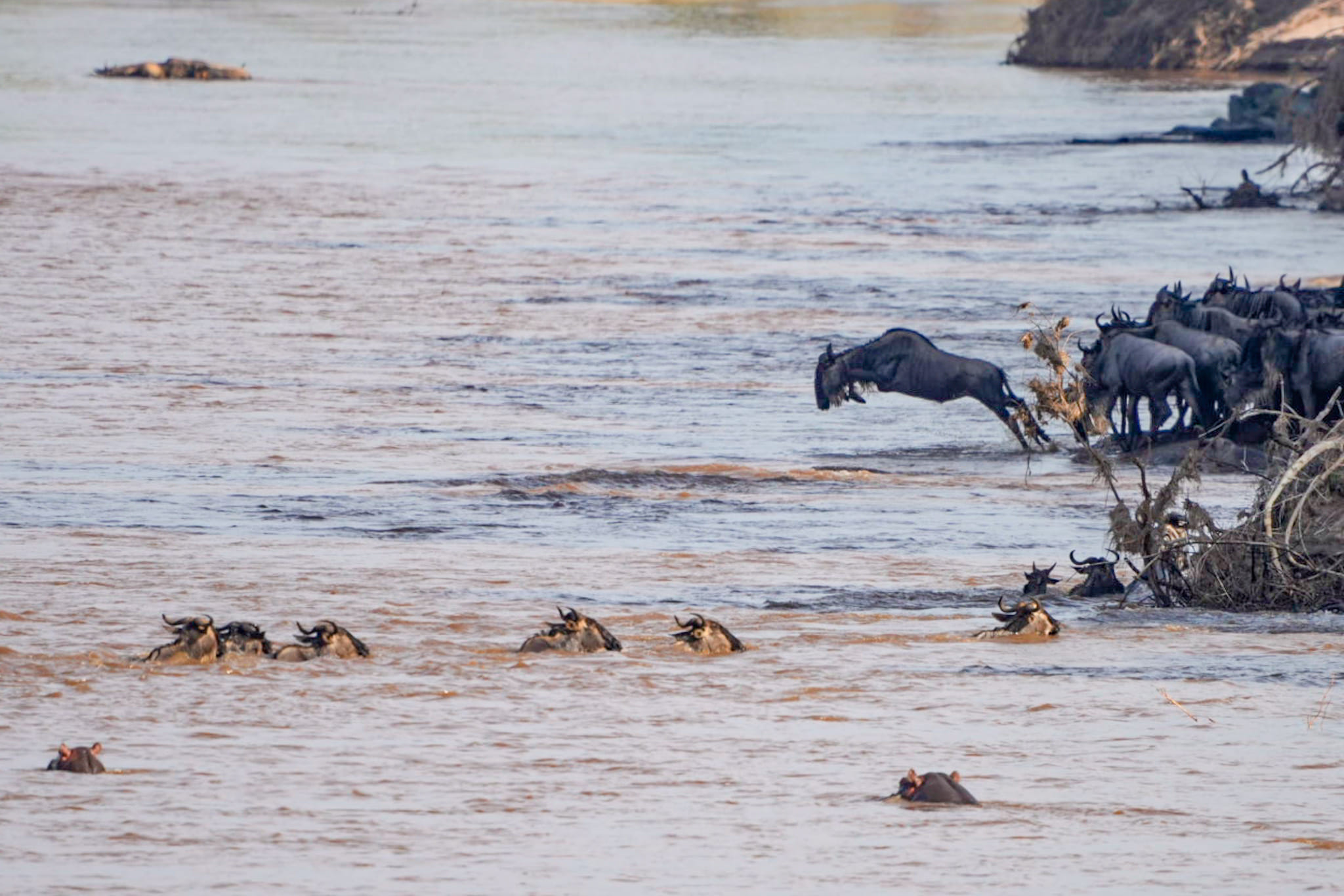 Gerade schwimmen tausende Gnus durch den Mara-Fluss