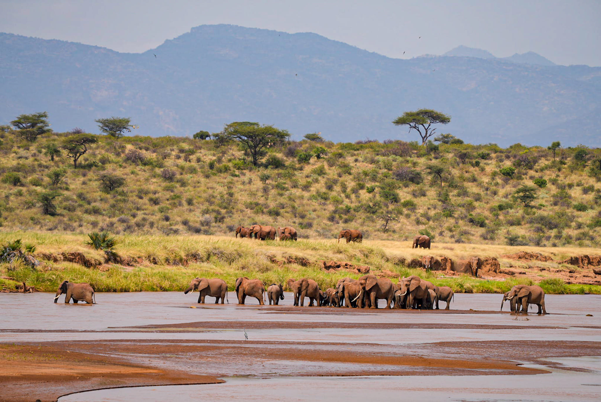 Viele Elefanten im Fluss in einer wunderschönen Landschaft. Das Leben ist schön und das Leben ist das, was wir daraus machen. Www.benny-rebel.de