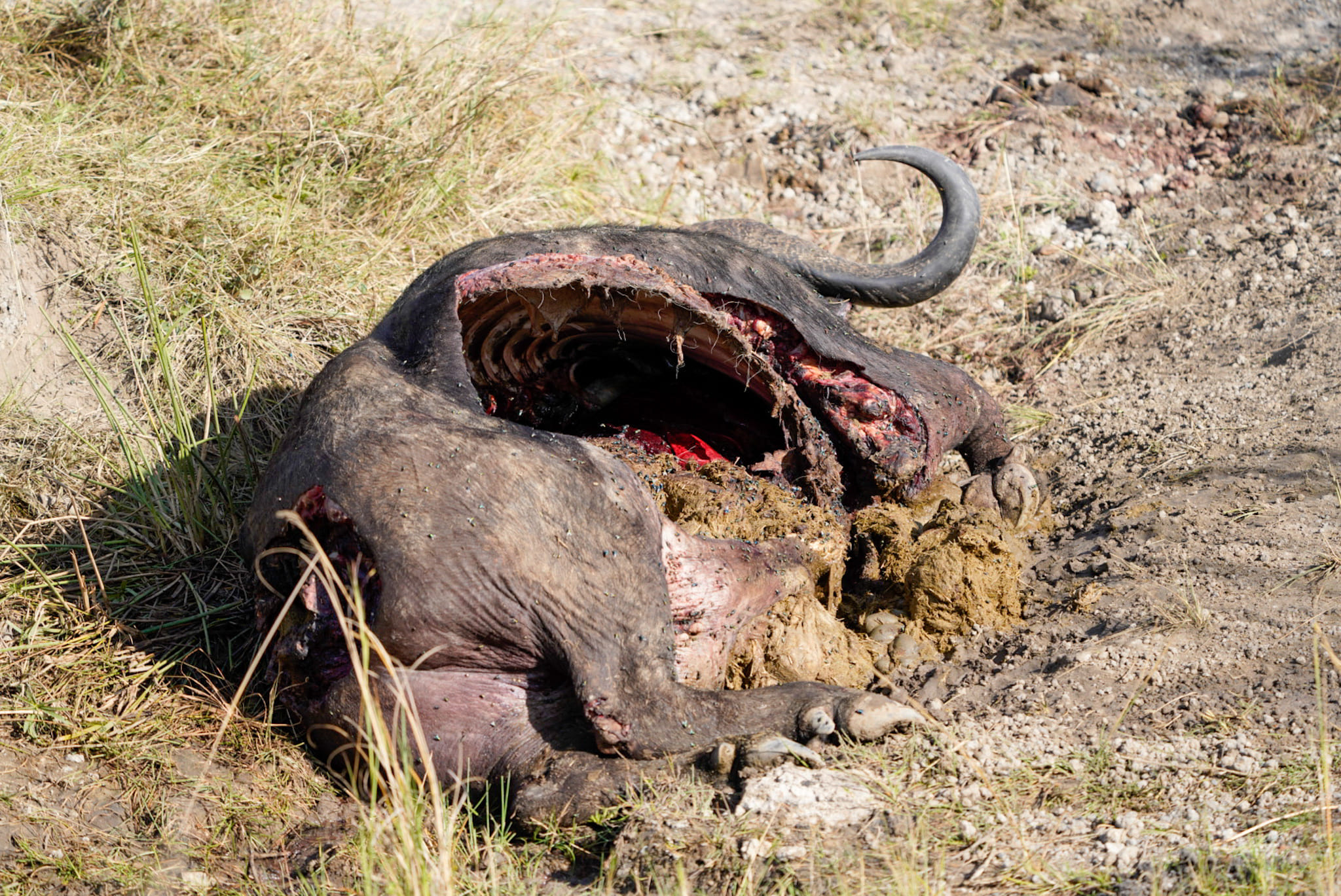 Heute in der Früh haben vier Löwenkater einen Büffelbullen getötet. Sie haben sich den Magen vollgeschlagen und nun ruhen sich im dichten Busch aus. Gerade eben kam ein Geier, um etwas von der Beute zu fressen aber die Löwen sprangen sofort auf und haben ihm keine Chance gegeben, etwas stehlen zu können. Die erste Hyäne ist auch schon da und schaut, was machbar ist. Es wird also...