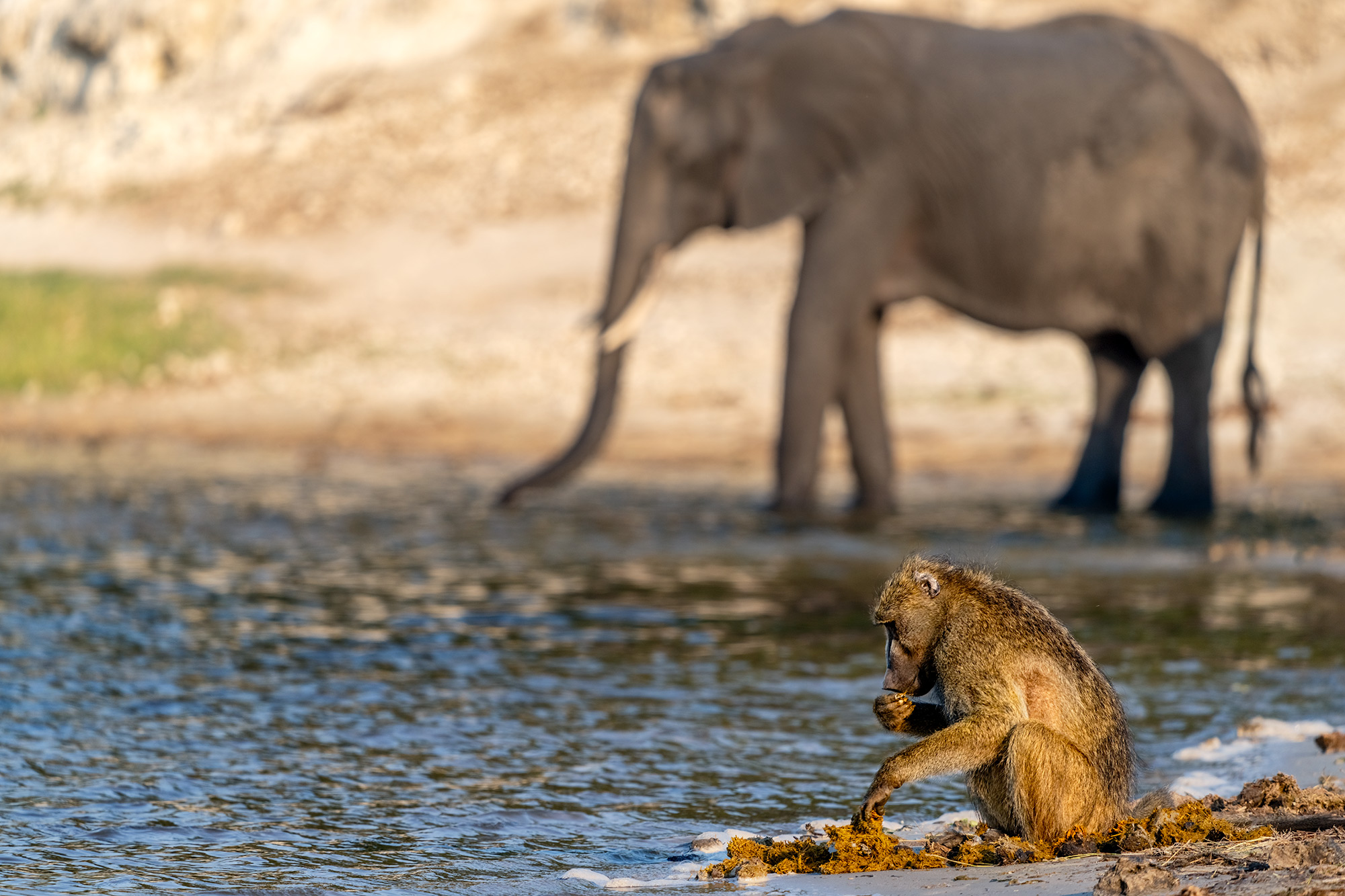 Ein sehr junger Pavian trinkt am Ufer des Chobe-Flusses Wasser. Sein Vater hält seine wachsamen Augen auf, denn in der Wildnis gibt es viele Gefahren. Im Fluss lauern Krokodile, die blitzschnell einen Pavian jagen können. Große Adler, Pythonschlangen oder Raubkatzen können ebenfalls den Pavianen gefährlich werden. Trotz der allgegenwärtigen Gefahren in der Wildnis genießen die...