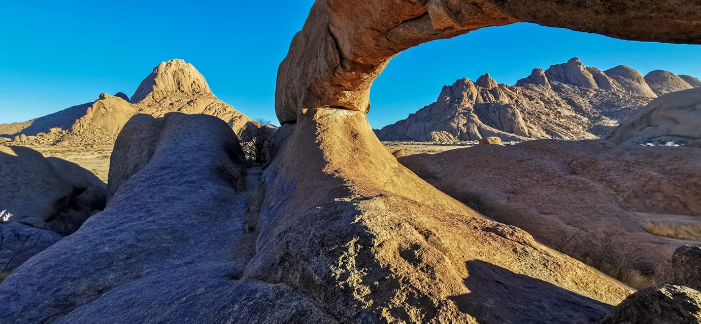 Der sitzende Mensch links im Bild soll die Dimensionen des Steinbogens in dieser bergigen Region in Namibia veranschaulichen. Durch diesen Steinbogen sehen wir die Bergkette, die sich in einigen hundert Metern Abstand befindet. Es sieht so aus, als würden wir durch ein Auge nach außen schauen. In meinem letzten Blogbeitrag habe ich eine Nachtaufnahme von demselben Steinbogen...