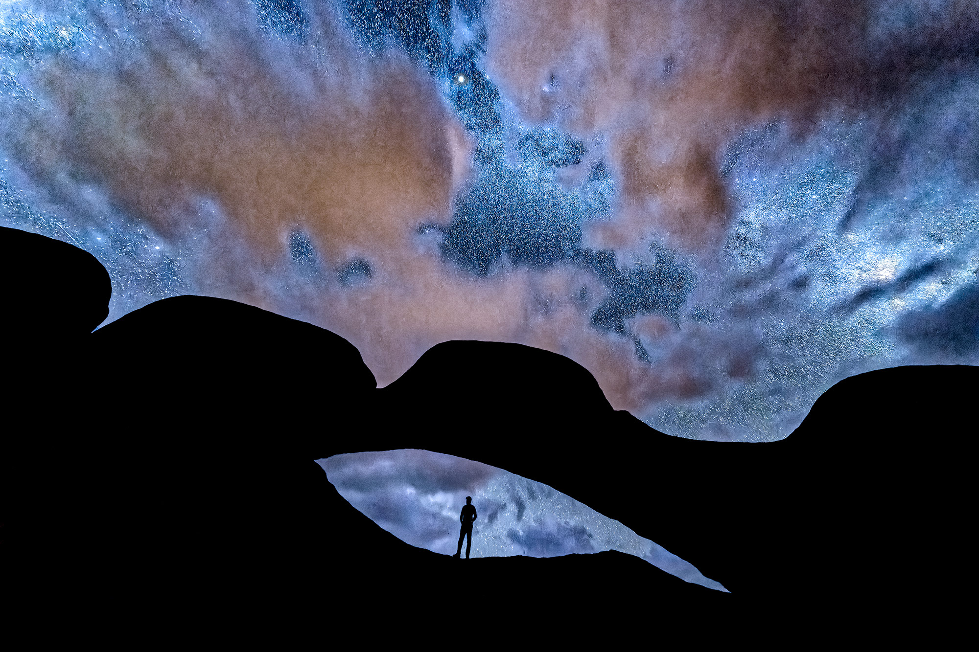 30 Sekunden lang durfte mein Kumpel sich nicht bewegen. Während dieser Zeit hat meine Kamera das Licht des Sternehimmels aufgenommen. Ich habe meinen Freund gebeten, sich unter den Felsbogen zu stellen, damit die Dimensionen des riesigen Felsen sichtbar werden. Das Bild habe ich in Namibia aufgenommen und ich habe sehr schöne Erinnerungen von diesem Abend. Die Teilnehmer meiner...