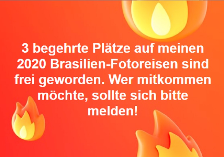 Liebe Freunde, Benny Rebels Fotoreisen durch Brasilien sind äußerst beliebt und fotografisch extrem ergiebig. Ihr habt sicher die Fotos gesehen, die er im Juni und Juli von Brasilien aus gepostet hat.Da seine Gäste oft 2 bis 3 Jahre im Voraus buchen, ist es nicht auszuschließen, dass durch Krankheiten, Jobveränderungen oder anderen privaten...