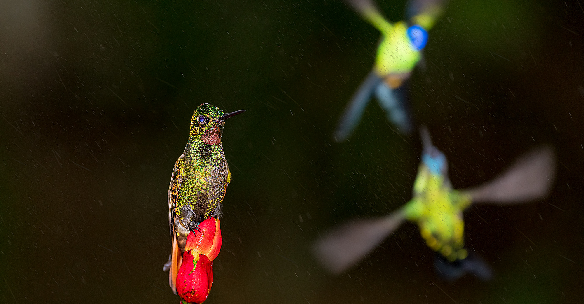 Ein Kolibri sitzt im Regen, während zwei andere sich in der Luft streiten