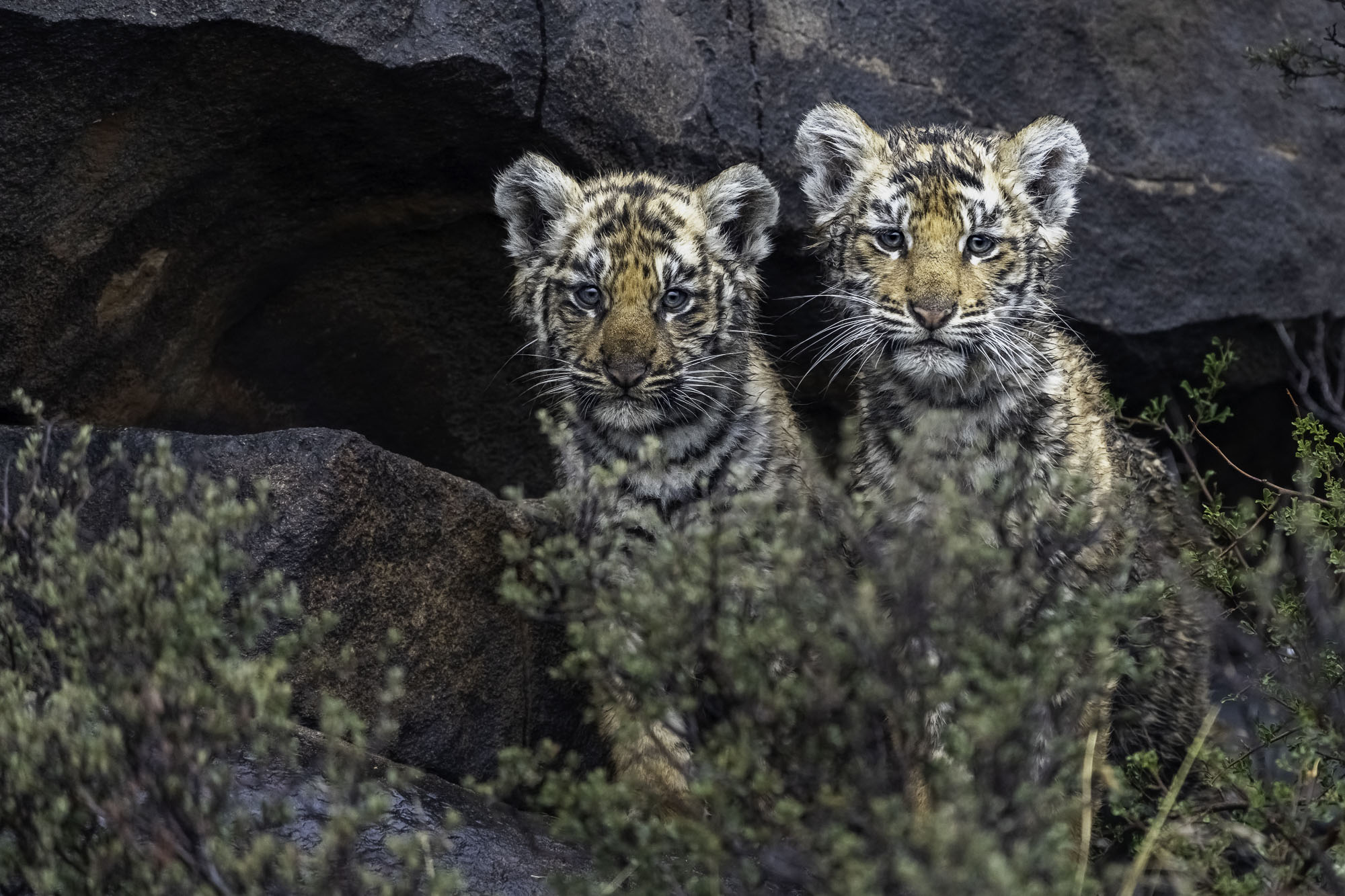 Während die Mutter auf die Jagd gegangen ist, halten sich die kleinen Großkatzen brav in einem Felsenspalt auf, um vor anderen Raubtieren geschützt zu sein.