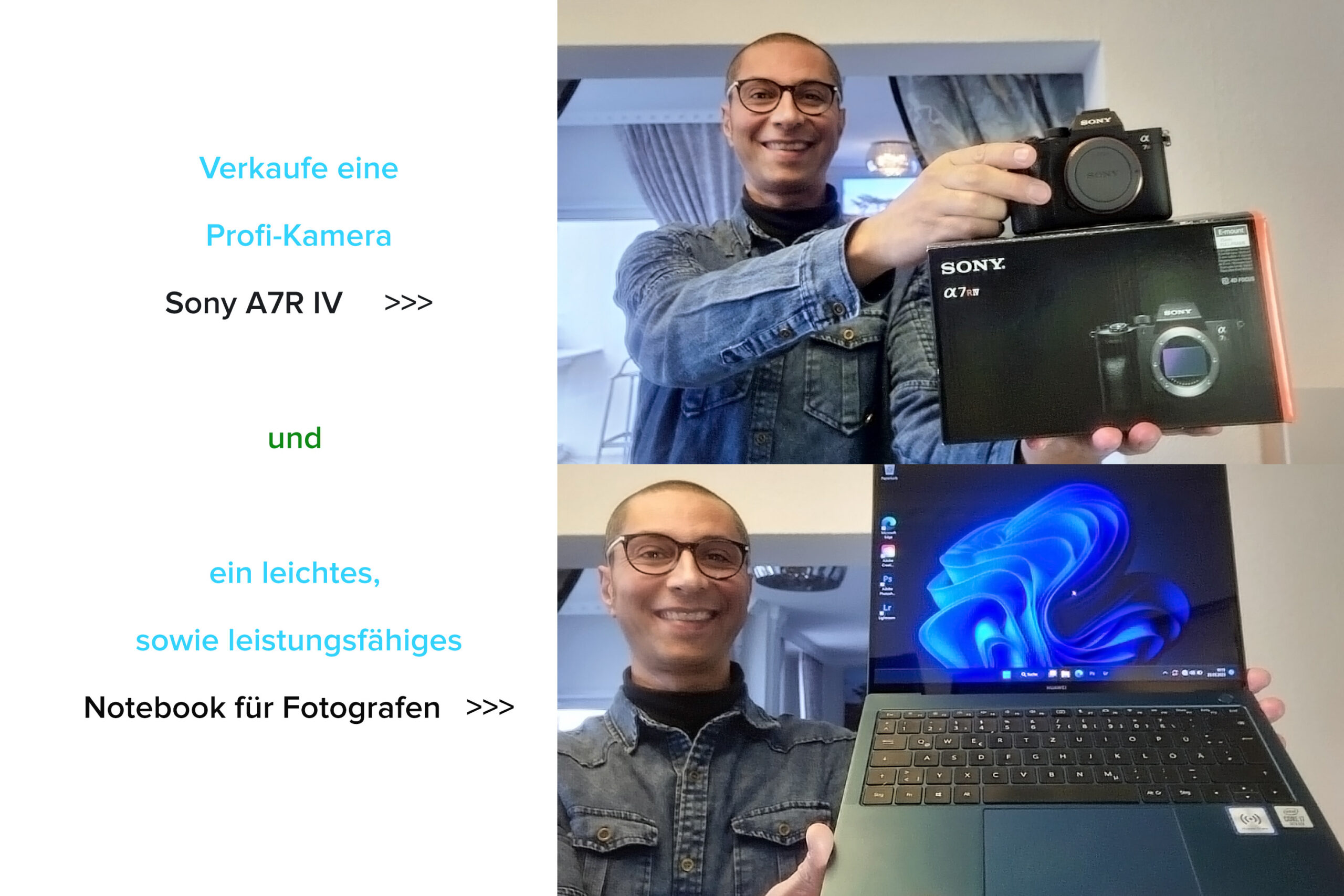 Passend zu dieser Kamera verkaufe ich ein leichtes und leistungsfähiges Notebook, worauf bereits Photoshop und Lightroom installiert sind. Du kannst Deine Adobe-IDs eingeben und sofort loslegen.