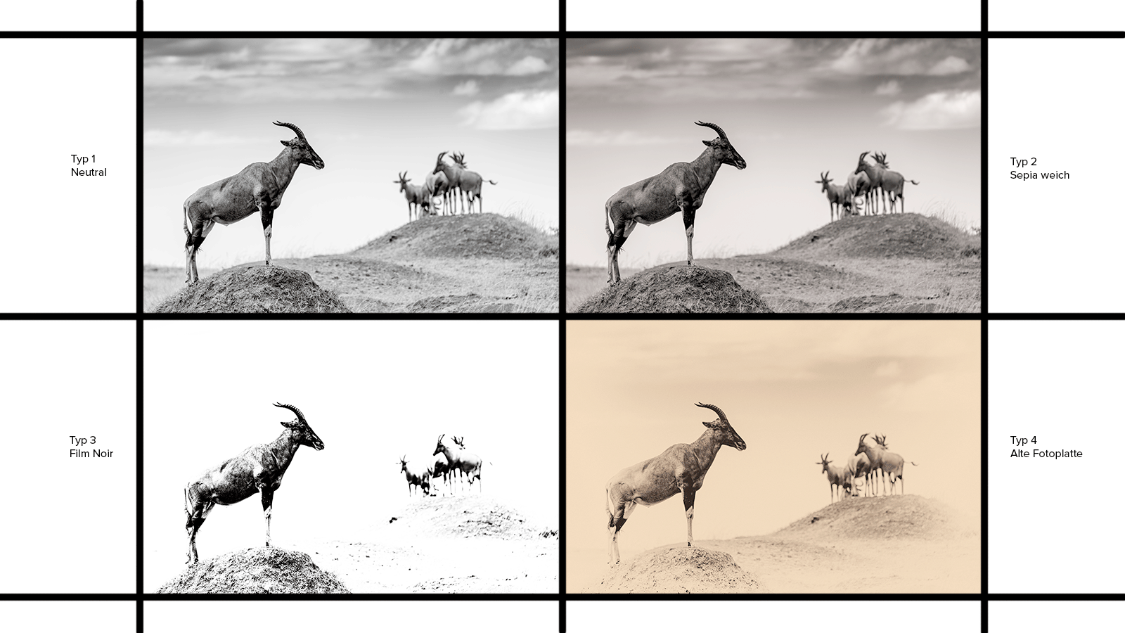 - Typ 1 oben links zeigt eine ganz normale oder klassische Schwarzweißumwandlung