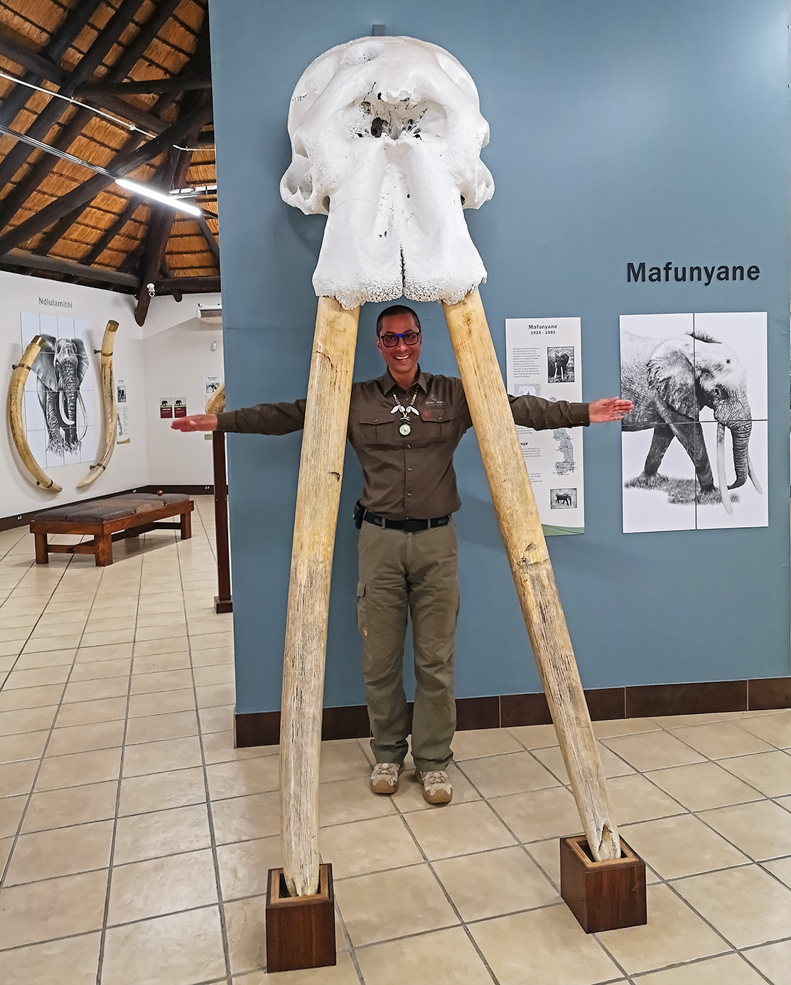 Heute seht Ihr ein Bild von mir mit dem Schädel und den Stoßzähnen des verstorbenen Mafunyane. Er war einer der „Magnificent 7“ (glorreichen sieben). Diese sieben Elefanten, die im Krüger Nationalpark in Südafrika gelebt haben, gehörten zu den größten und beeindruckendsten Elefanten in Südafrika und ihre Lebensgeschichte wird den Besuchern in einem kleinen Elefantenmuseum im Rest Camp Letaba präsentiert.